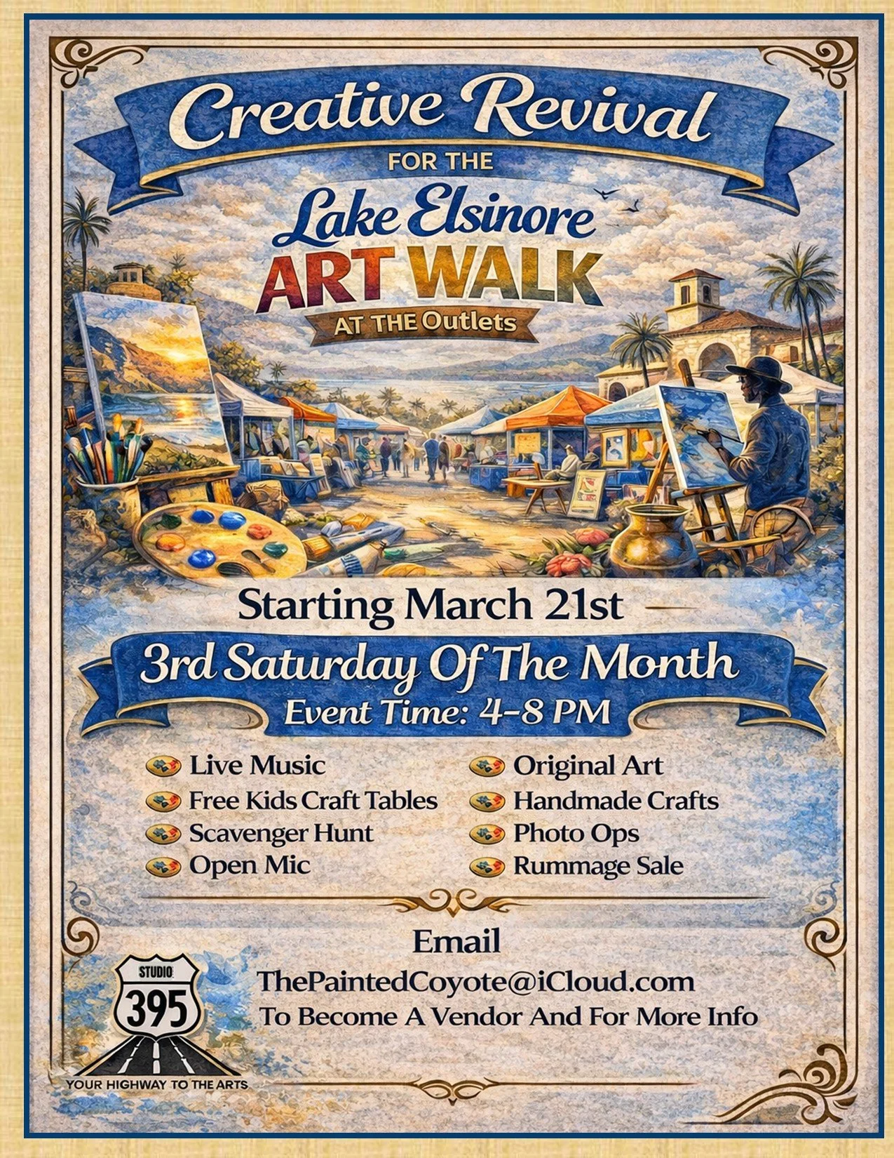 Lastly, make sure you come out for our our revival of STUDIO 395 's Third Saturday Art Walk right here at the Outlet. This gathering of local musical performers, art and crafts vendors, and art activities started on Main Street at the old Flower Fusion Bakery back in 2012. Over the years it moved to the park on Main Street and then to La Rebelde Winery. We are planning for a 2026 of third Saturdays so that locals can gather for some shopping and entertainment. Our primary intent always is to provide an outlet for local creatives and those who support them. I'm so excited for this restart of a signature STUDIO 395 event. I really hope you will plan to be there at our first revival version on March 21st from 4 to 8 pm. Bring the family!