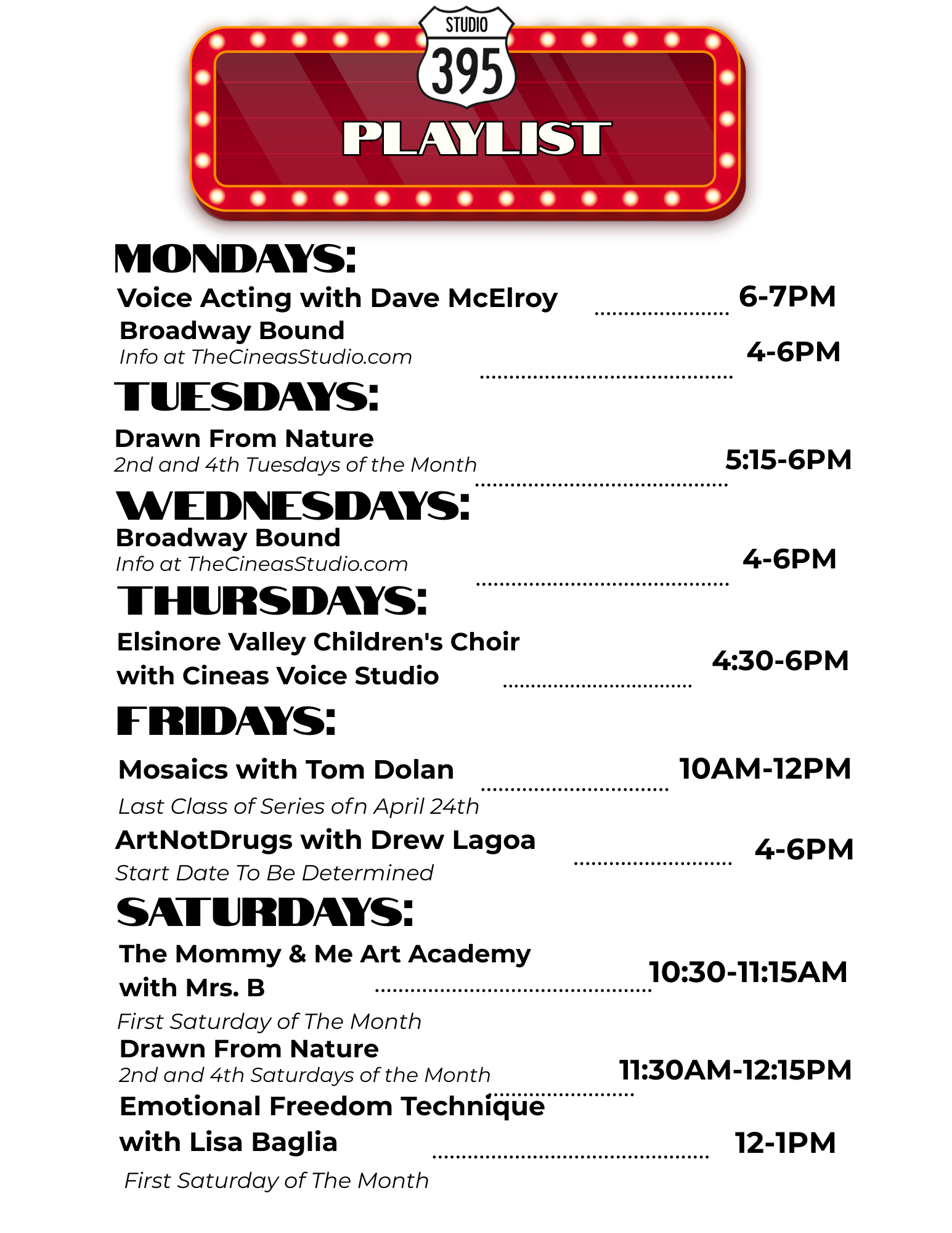 Discover your creative side with STUDIO 395! We’re excited to offer a variety of enriching classes for all ages, including voice acting, voice lessons, art classes, and Emotional Freedom Technique. Whether you're here to create, connect, or recharge, there's something for everyone in our vibrant community.